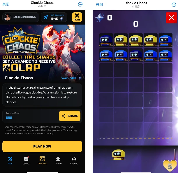 Clockie Chaos 为 TG 小游戏,玩家通过每日签到、每日解密、完成社交任务、玩消消乐类型游戏获得更多时间碎片积分。