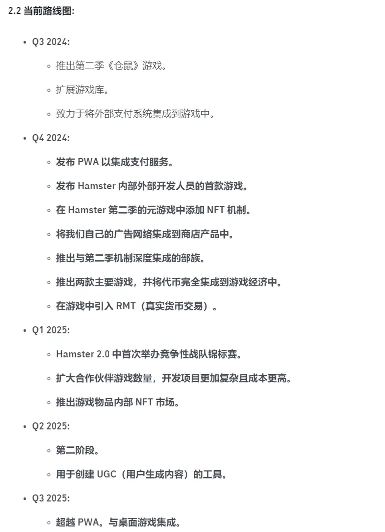 2024 年 Q4 将发布 PWA 的支付服务集成并发布 Hamster 外部开发的首款游戏、将广告集成到商店产品中、推出与第二季机制深度集成的部族、在游戏中引入 RMT(真实货币交易)并将代币完全集成到游戏经济中;
