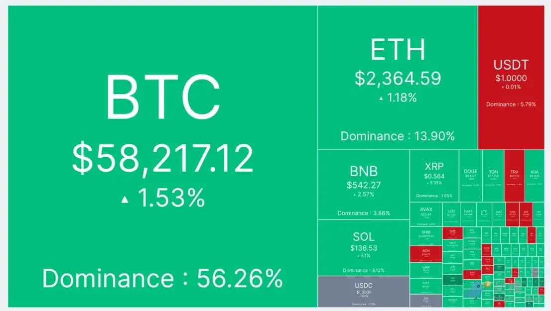 截至发稿时,比特币交易价格为 58, 217 美元, 24 小时涨幅 1.53% 。