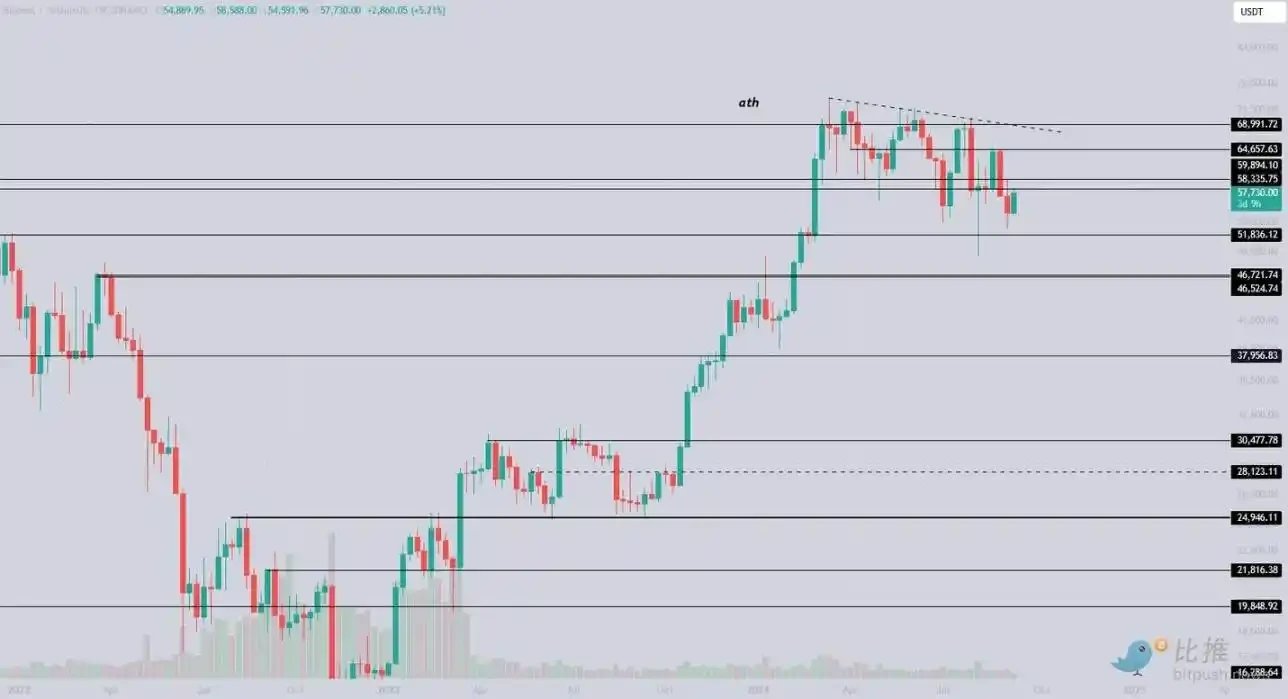 Bloodgood 总结道:「在撰写本文时,BTC 位于突破区域下方,这是近期趋势的关键点,突破这一水平将迅速导致更高水平,而跌破的话将使未来几周内非常有可能测试 5 万美元。从 TA 的角度来看,结构仍然看跌,因此在较低的高点被打破之前,我不会抱有希望。」