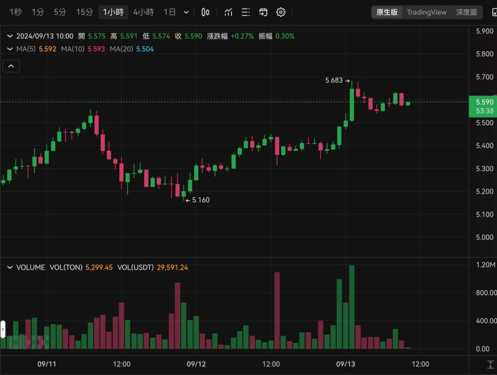 另一方面,TON 受到的激励似乎更大。消息公布后的三小时内一度上涨近 5.5%,最高触及 5.683 美元。