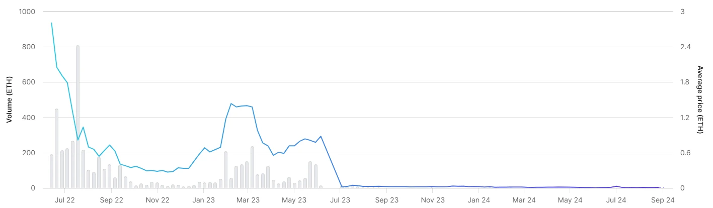 在这一初始阶段之后,市场迎来了第二波浪潮,即会员制 NFT 的出现,这些 NFT 主要由大型公司支持。尽管这些 NFT 的发行价格最初大幅上升,但随后交易量和价格都急剧下降,几乎没有复苏的迹象。