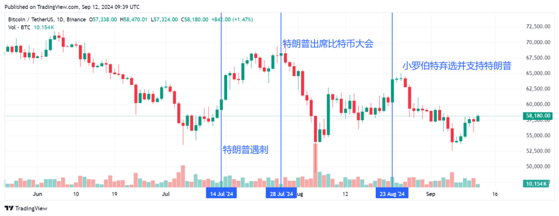 7 月 14 日上午,作为候选人的特朗普遭遇刺杀,当日 BTC 上涨 2% ,突破 6 万美元关口,并在次日再次上涨 6% ,升至 6.5 万美元附近,并在这之后震荡上扬。