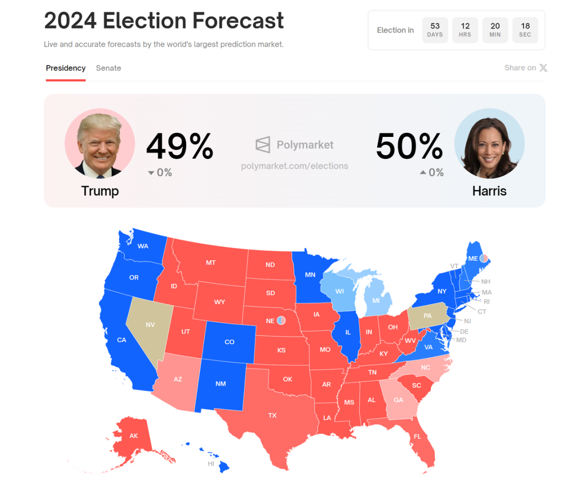 真正让 Polymarket 爆火的则是今年美国最热门的总统大选事件。特朗普遇刺之后的胜选率、拜登退选率、哈里斯参与竞选之后的胜选率在不断地各类声明、辩论中引起数据的变化波动。