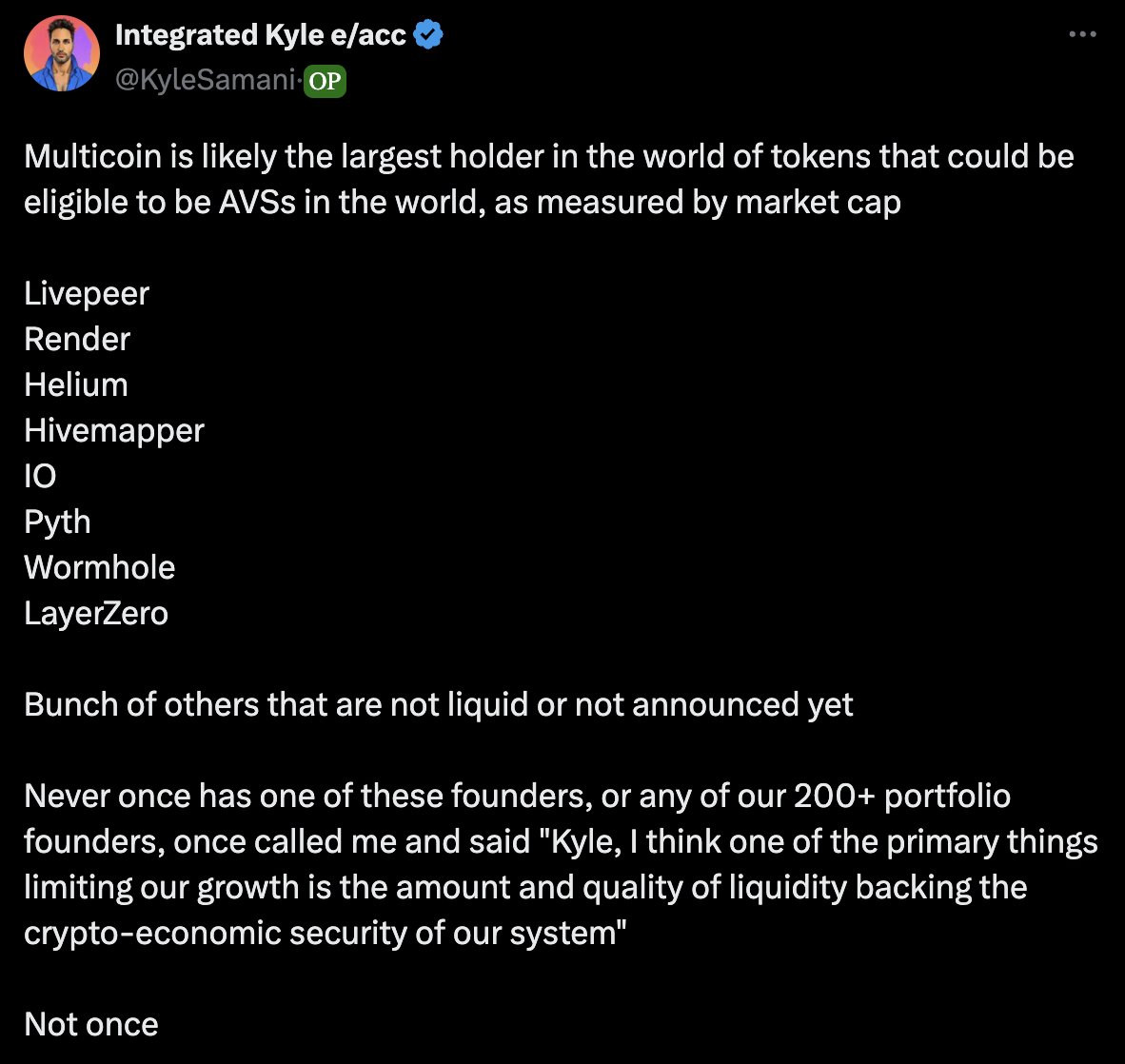 Integrated Kyle e/acc:“Multicoin 可能是全球最大的持有者,其按市值计算的 Token 可能有资格成为 AVS。