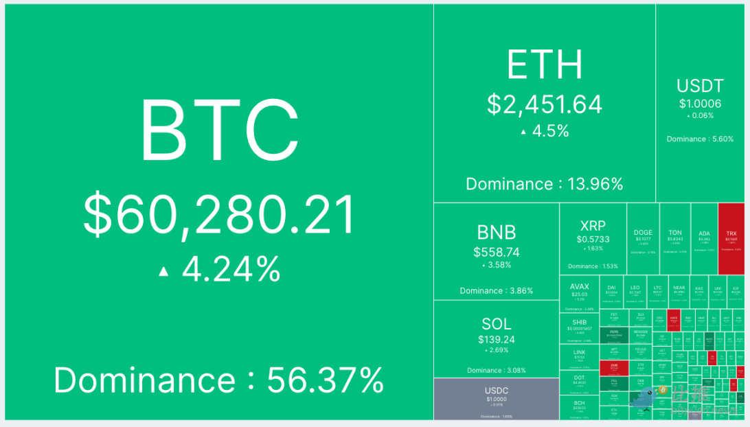 比推数据显示,当天早些时候,BTC 短线飙升逾 1, 500 美元,从 58, 000 美元跃升至 59, 700 美元,在美股收盘后涨破 69, 000 美元。截至发稿时,BTC 交易价格为 60, 280 美元, 24 小时涨幅 4.24% 。