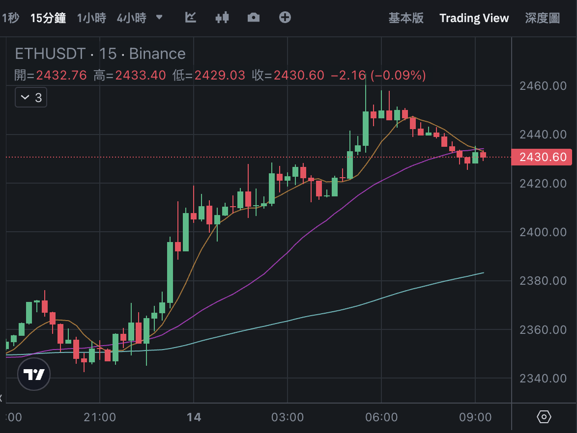 以太坊的走势与比特币雷同,自昨晚的 2,342 美元低点,清晨最高来到 2,464 美元。撰稿当下报 2,430 美元、近 24 小时上涨 3.19%。