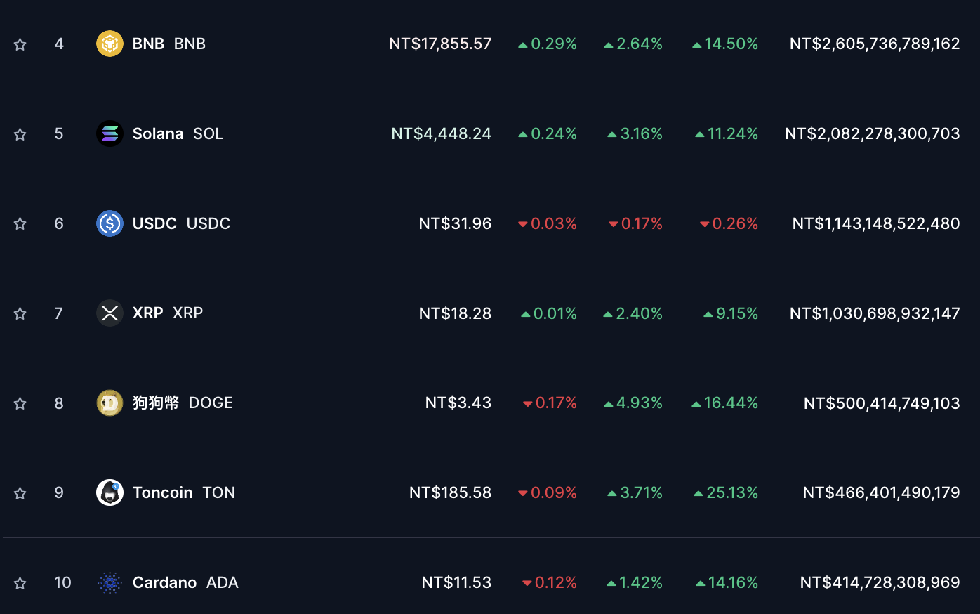CoinMarkeCap 数据 显示 ,其他前十大代币近 24 小时皆出现上涨,其中涨幅最大的为狗狗币,上涨了 4.93%,其他代币也都有约 1.5% 以上的涨幅,但皆不及比特币的表现。