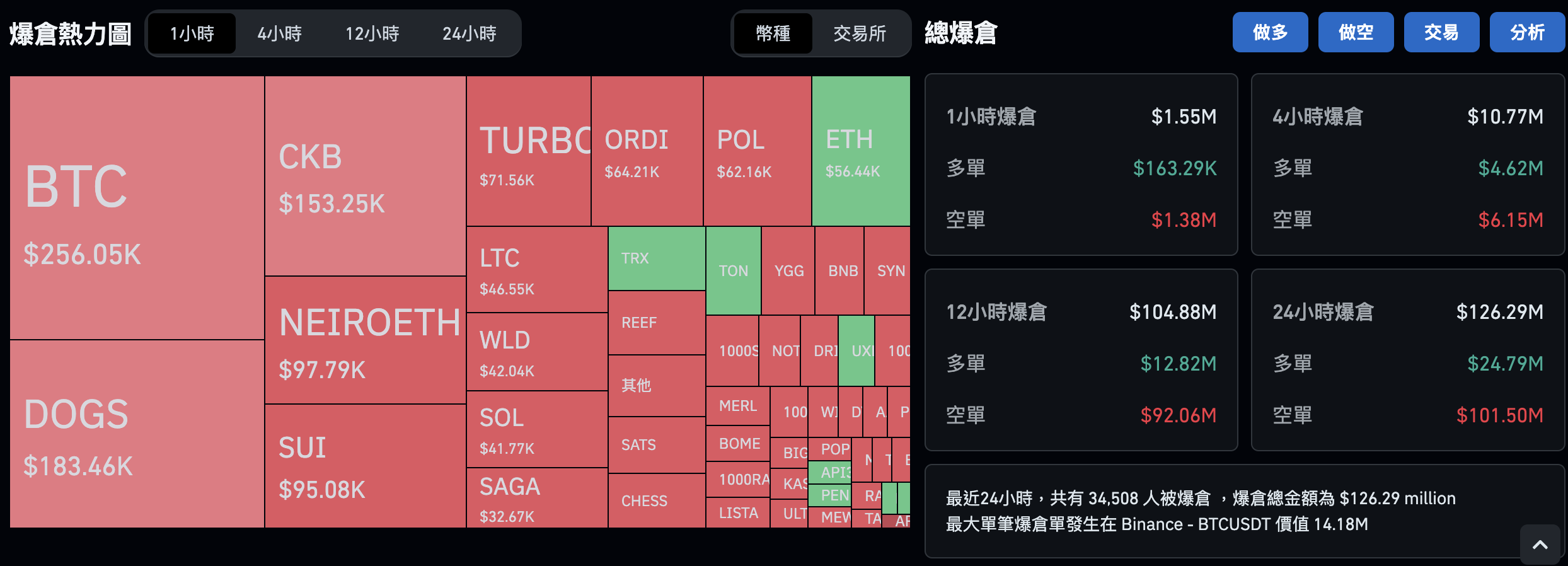 比特币站回 6 万美元的行情,使得加密货币市场主爆空单。据 Coinglass 数据 显示,过去 24 小时,加密货币全网爆仓金额超过 1.26 亿美元,有超过 3.4 万人遭清算。