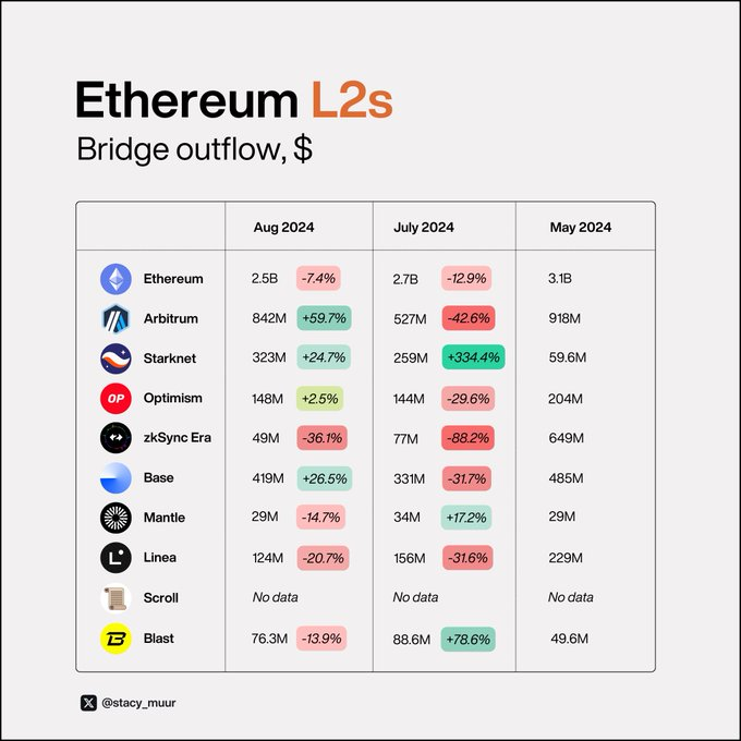 在 L2 中,净流量为正的有 @Arbitrum 、 @StarknetFndn 、 @Optimism 、 @base 和 @0x Mantle ,其中 @0x Mantle 的流入和流出差距最大。