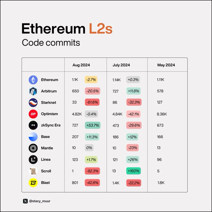 最令人惊讶的是 @blast ,目前拥有超过 300 名核心开发人员(相比之下,大多数 L2 通常只有 30-50 名)。这个庞大的团队也贡献了大量的代码提交。