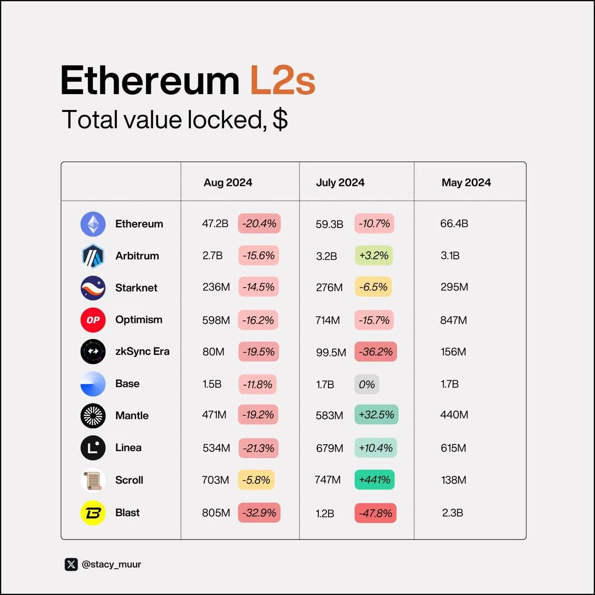 在 TVL 方面,除了像 @Scroll_ZKP 、 @LineaBuild 和 @0x Mantle 这样有持续激励计划的链,所有链都经历了一个艰难的夏天。