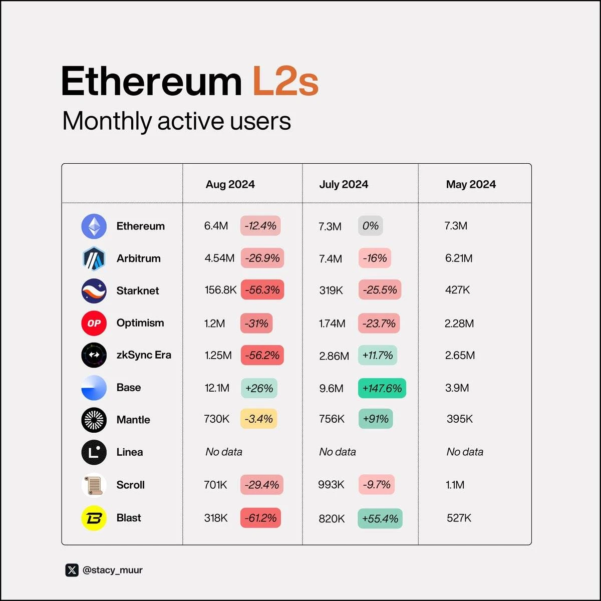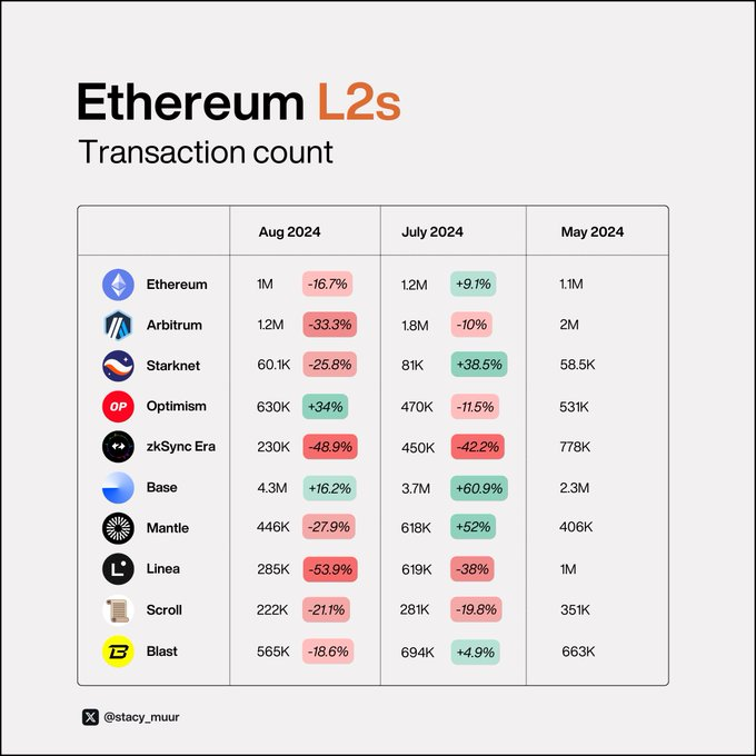 @0x Mantle 和 @base 表现出色,而 @StarknetFndn 、 @zksync 和 @blast 表现不佳。