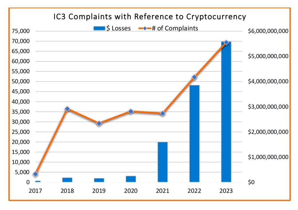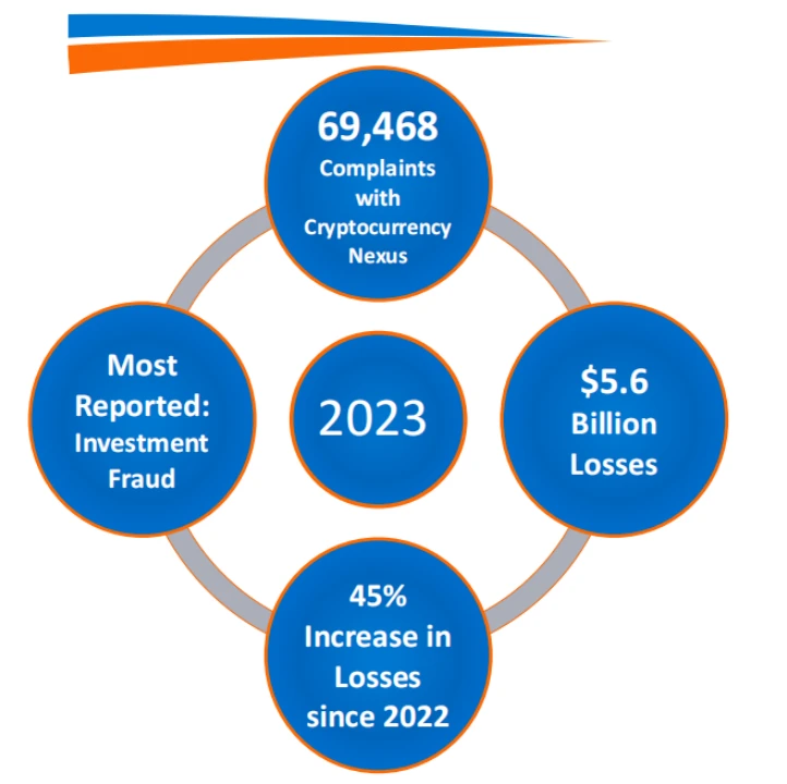 2023 年,美国联邦调查局(FBI) 互联网犯罪举报中心( IC3 ) 共收到超过 6.9 万起涉及加密货币的金融欺诈投诉,涉及的损失总额超过 56 亿美元。尽管涉及加密货币的投诉只约占总金融欺诈投诉的 10% ,但这些投诉造成的损失却占总损失的近 50% 。