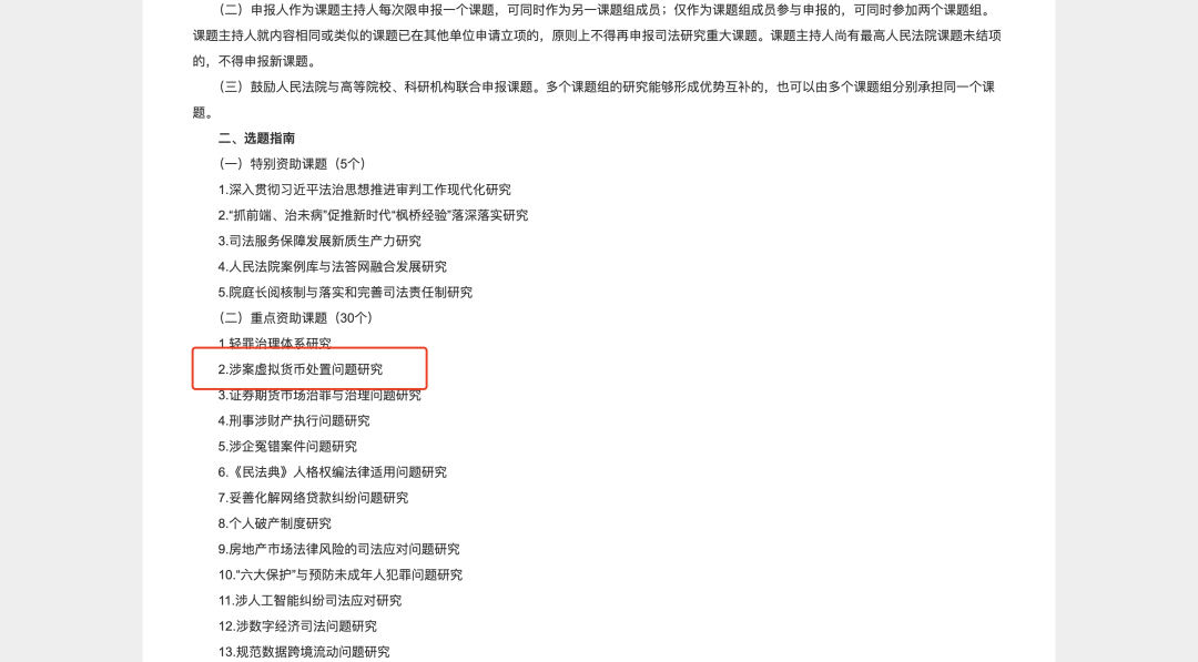 8 月底,最高人民法院发布《 2024 年度司法研究重大课题招标公告 》。乍一看,这和币圈关系不大,但细品你就能发现,重点资助课题中赫然写着“涉案虚拟货币处置问题研究”。或许你还觉得,“害,这不就是个课题研究嘛,落到实践层面还不知道要猴年马月!”