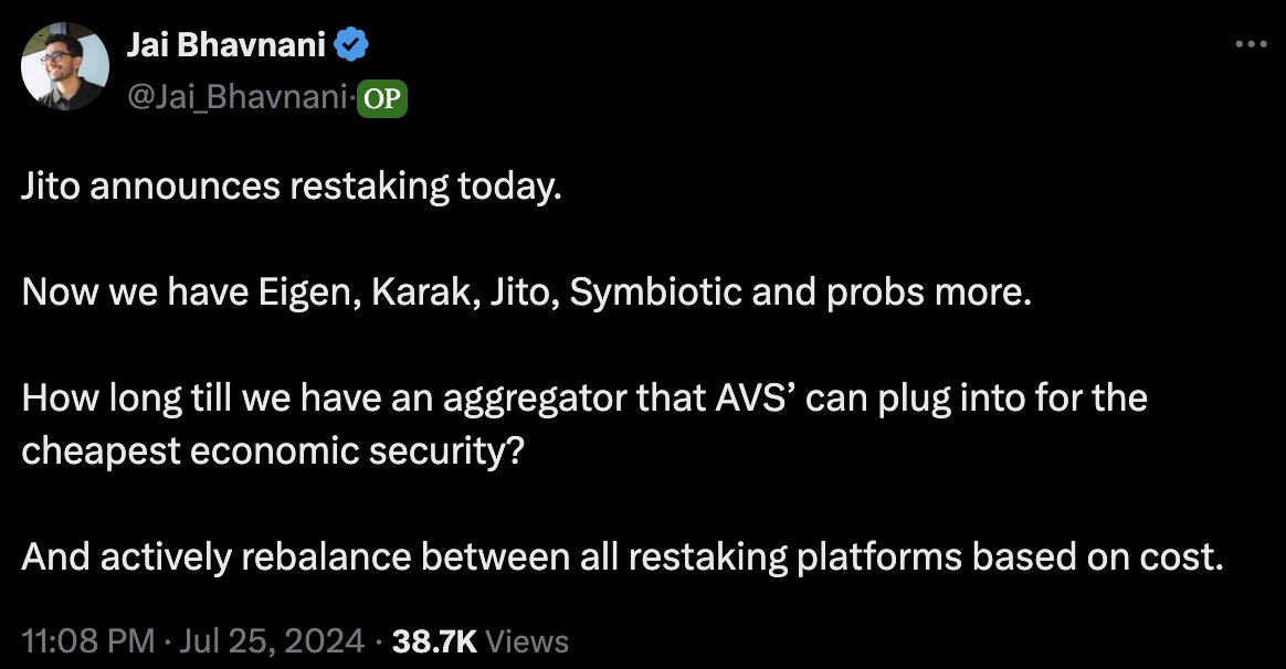 Jai Bhavnani:「Jito 今天宣布支援再质押。 现在我们有 Eigen、Karak、Jito、Symbiotic 等,可能还有更多。 我们要多久才能拥有一个聚合器,让 AVS 可以接入以获取最经济的安全保障? 并能根据成本在所有再质押平台之间主动进行重新平衡。」