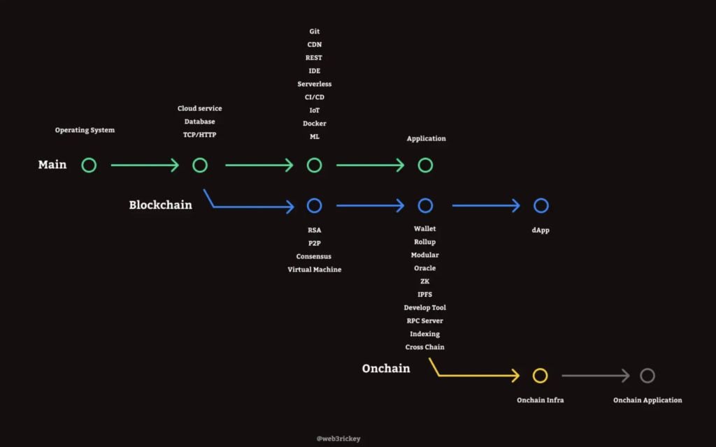 区块链类似于一个新的 git 分支。在这个分支的第一阶段,加入了密码学、P2P 网路、共识演算法等基础设施。这些基础设施可以用于构建比特币、以太坊及其他 L1 网路。