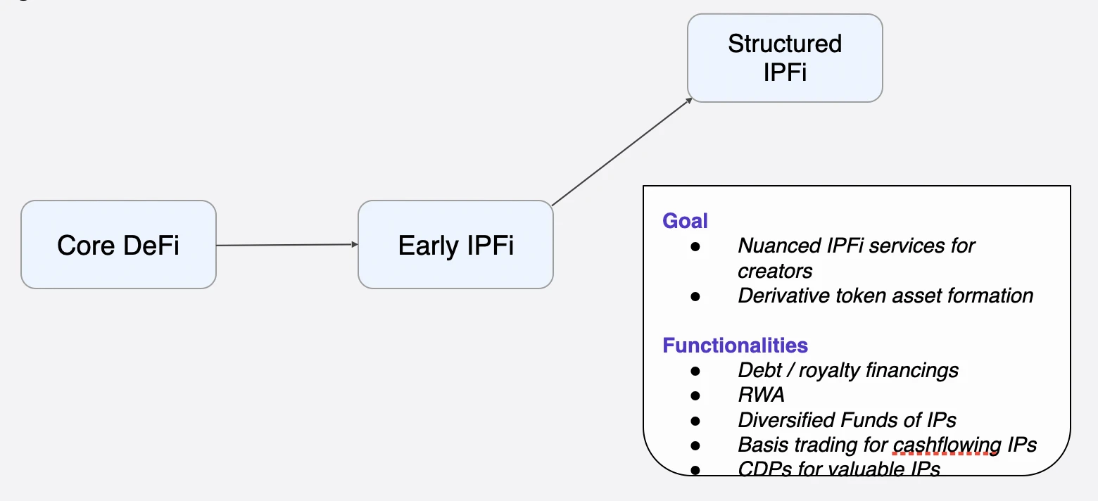 接下来,我们将进入早期 IPFi 阶段。在该阶段,Story Protocol 将围绕 IP 提供两种不同却相关的代币类型。其一为授权代币,其主要效用为将创造者与消费者连接起来;其二为版税代币,其主要效用为实现 IP 收益的流动,举个例子,当你持有某个 IP 的版税代币,若该 IP 最终以电影等形式获利,你也将通过该代币获得相应的版税收益。我们还希望在早期 IPFi 阶段进行一些实验,比如我们认为所有曾投资过 memecoin 都可以围绕一个共识性形象来构建社区、内容,并将其转变为真正的 IP 项目。