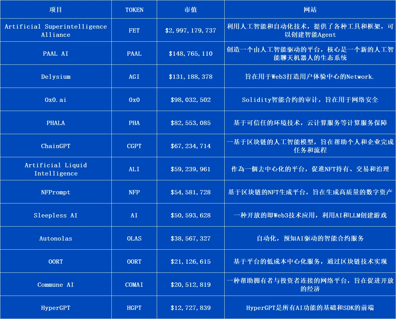 根据前文分析,即便是获得顶级融资并拥有良好用户流量的 AI Agent 应用,也面临着商业变现的难题。接下来我们将深入分析当前 AI Agent 项目在Web3内的发展情况。通过对一系列代表性项目的评估—包括它们的技术创新、市场表现、用户反馈以及发展潜力,旨在挖掘出具有启发性的建议。下图为目前市场上已发代币且市值较高的几个代表性项目: