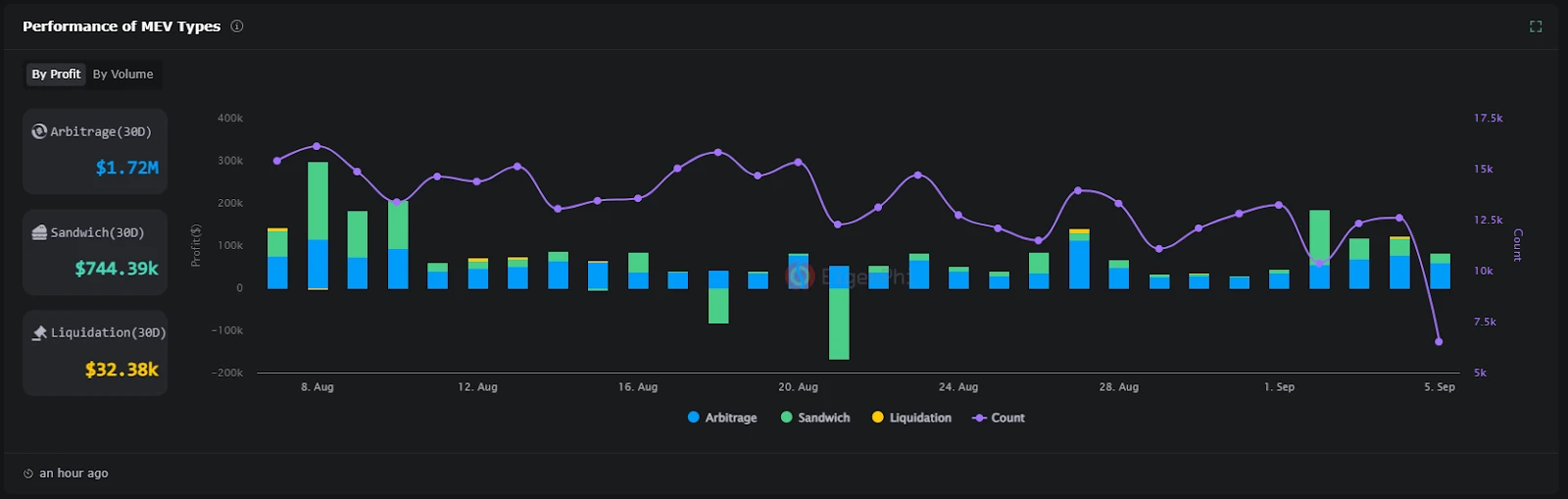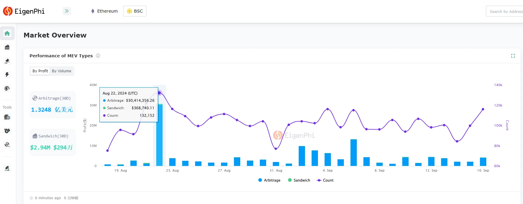 不过,从数据上来看,BSC 上的 MEV 总体利润要远远高于以太坊,据 Eigenphi 显示,BSC 链近 30 天的 MEV 总收入约为 1.33 亿美元,其中套利收入约为 1.3 亿美元,三明治攻击收入仅为 280 万美元。其中, 8 月 22 日数据显示当天套利收入达到 3000 万美元,这一数据显得有些异常。整个 BSC 链 8 月份的总交易量才为 200 亿美元,MEV 收入的数据为何能达到这么高的数值确实值得怀疑。