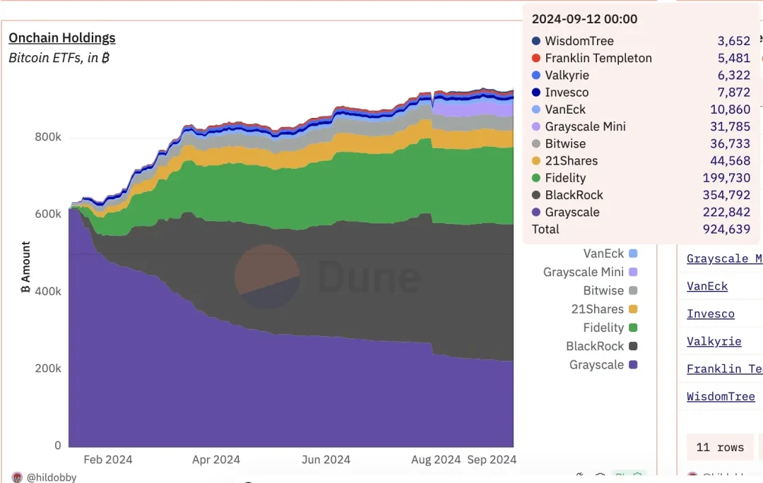 比特币 ETF 持有的比特币数量变化图,来源:Dune