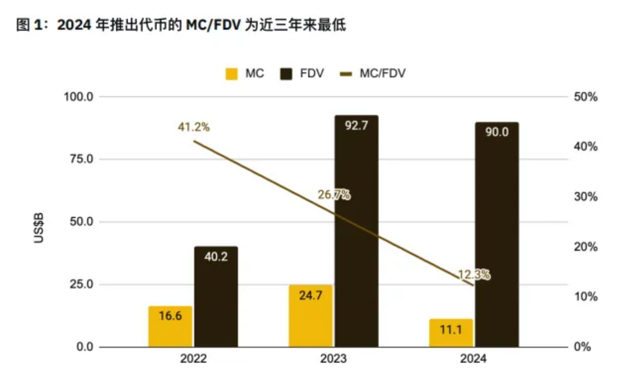 近期,与以往相比,一级市场发行的 Token 普遍呈现出极高的完全稀释估值(FDV)和低流动性的特征。根据币安的报告《高估值与低流动性 Token 的观察与反思》中的数据显示,2024 年发行的 Token 市值(MC)与完全稀释估值的比率是近年来最低的。这表明大量 Token 未来尚未解锁,而到 2024 年前几个月,发行 Token 的完全稀释估值已接近 2023 年所有发行 Token 的总 FDV。
