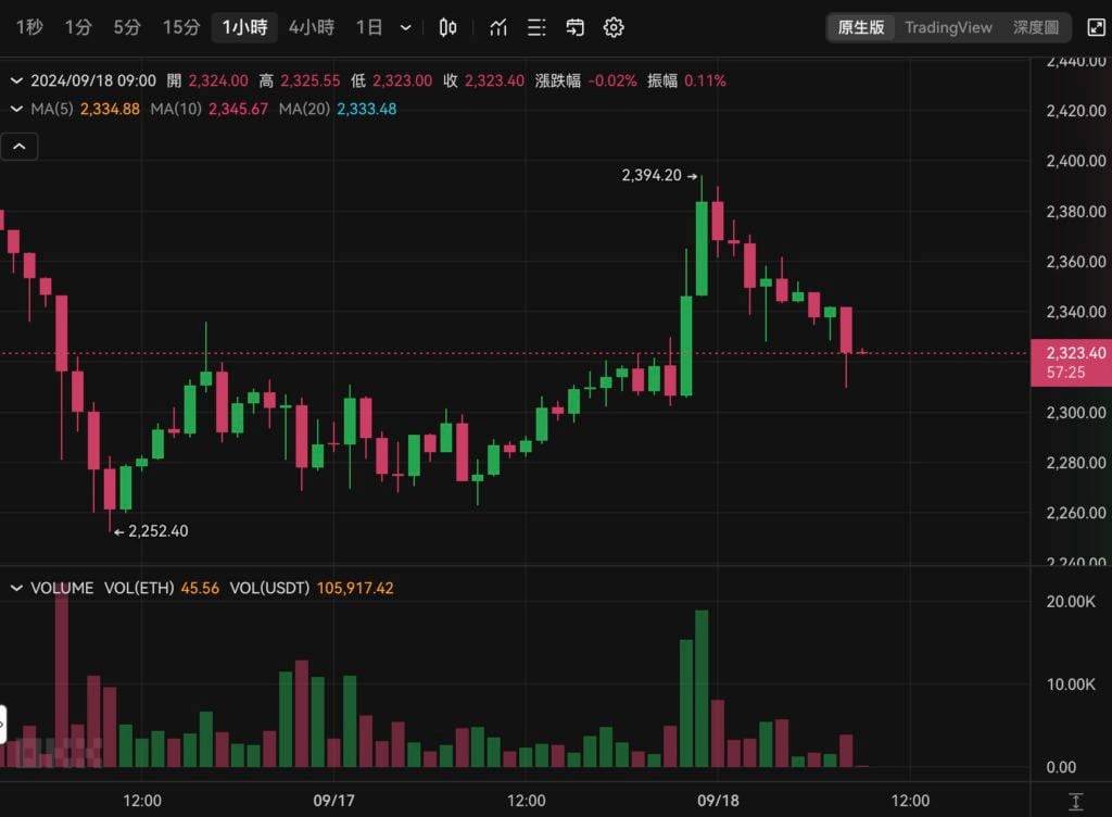 以太坊走势与比特币接近但较为颓势,昨晚最高来到 2,394 美元之后下挫,撰稿当下报 2,323 美元,近 24 小时上涨 2.32%。