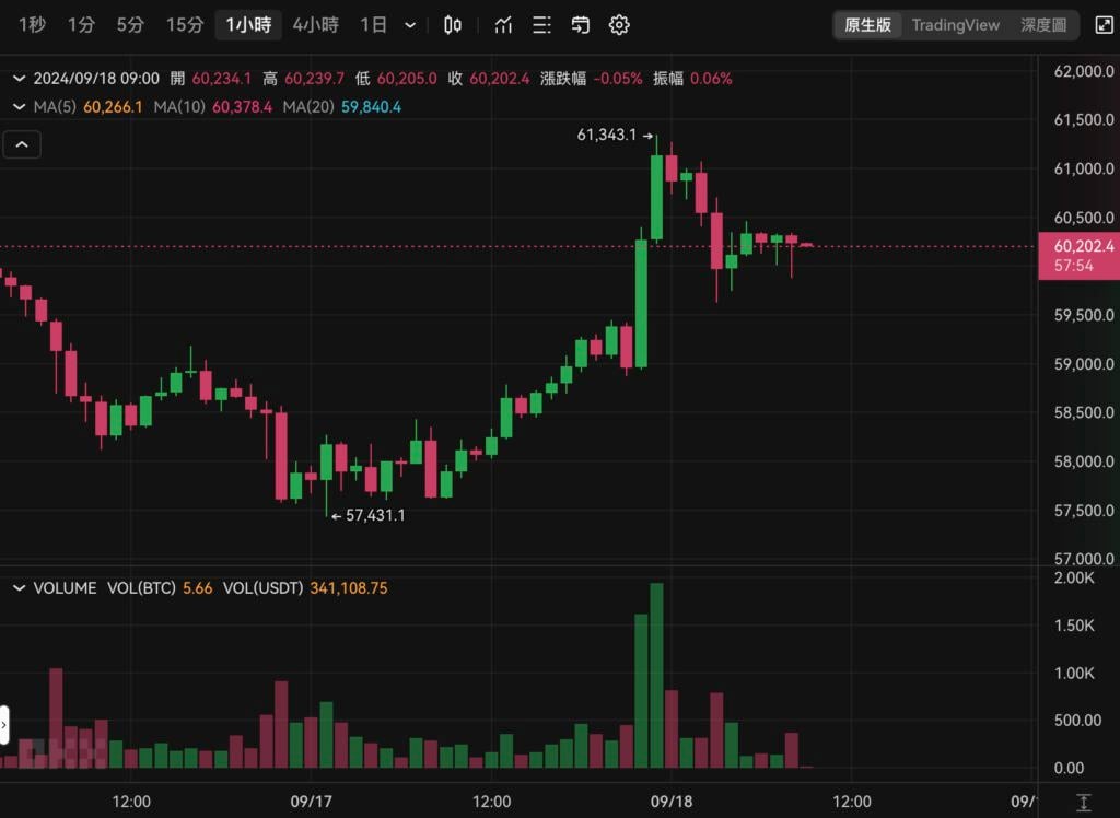 不过随后卖压涌现未能持续走高,今(18)日零点后𫔭始震盪走跌,撰稿当下报 60,202 美元,近 24 小时涨幅收敛至 4.34%。由于 19 日清晨联準会就将公布利率会议,请小心价格的剧烈波动。