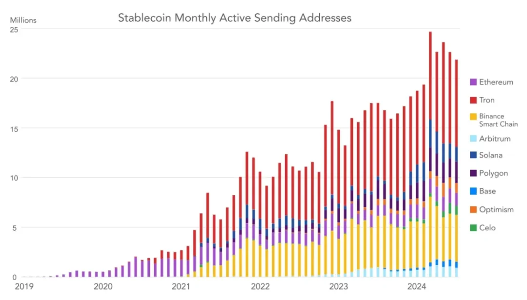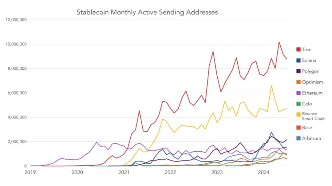 这再次表明,稳定币已经吸引了一批新的用户,他们不仅仅对使用它们进行交易所结算感兴趣。截至 2024 年 6 月,按结算价值计算,最受欢迎的区块链依次为 Ethereum, Tron, Arbitrum, Base, BSC 和 Solana。