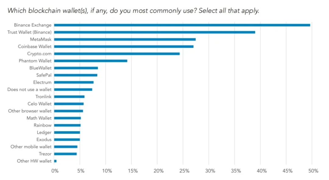 受访者中最受欢迎的钱包是 Binance,其次是 Trust Wallet、Metamask、Coinbase Wallet、Crypto.com 和 Phantom 钱包。