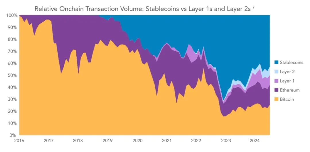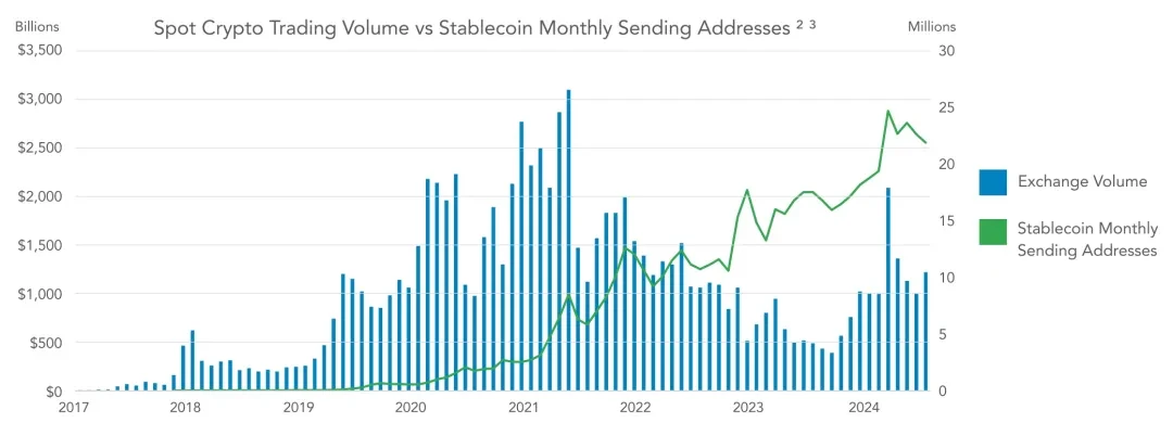 值得注意的是,尽管 2022 年和 2023 年加密资产遭到抛售,交易所交易量下降,但稳定币的结算量在整个市场周期中一直稳步增长。