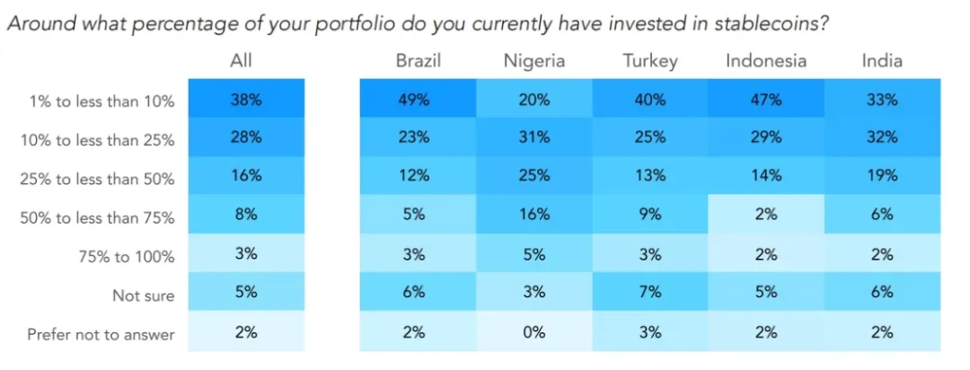对于稳定币在用户投资组合中的渗透程度。在国家层面,尼日利亚人的比例远远高于样本中的其他人群,其次是土耳其和印度。在印度用户样本中,最富裕群体的受访者还表示,他们的金融投资组合中稳定币的比例更大。