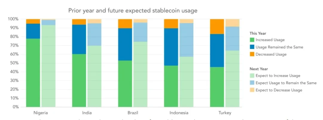 到目前为止,最受欢迎的用途是货币兑换,其次是购物和跨境交易。值得注意的是,样本中所有国家的大多数受访者都表示,他们曾将稳定币用于非加密货币交易用例。在所有接受调查的国家中,稳定币的使用量都在不断增长。大多数受访者表示,他们的使用量在过去一年有所增加,甚至有更大比例的受访者表示,他们将在未来一年进一步增加使用量。