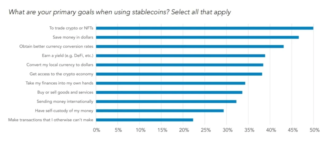 样本中稳定币用户最受欢迎的目标是交易加密货币或 NFT,但其他非加密货币用途也紧随其后。总体而言, 47% 的受访者表示他们的主要目标之一是节省美元, 43% 的受访者提到更好的货币兑换率, 39% 的受访者表示赚取收益。