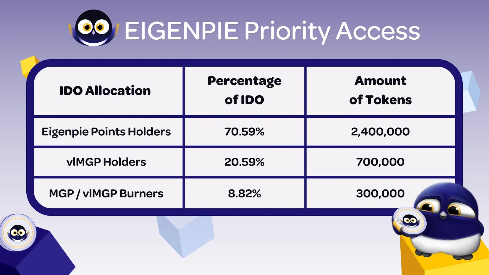 私募轮(FDV 300 万美元):价格 0.3 美元,持续 24 小时, 70.59% 代币将分配给 Eigenpie 积分持有者、 20.59% 代币将分配给 vlMGP 持有者、 8.82% 代币将分配给 MGP / vlMGP 销毁者;