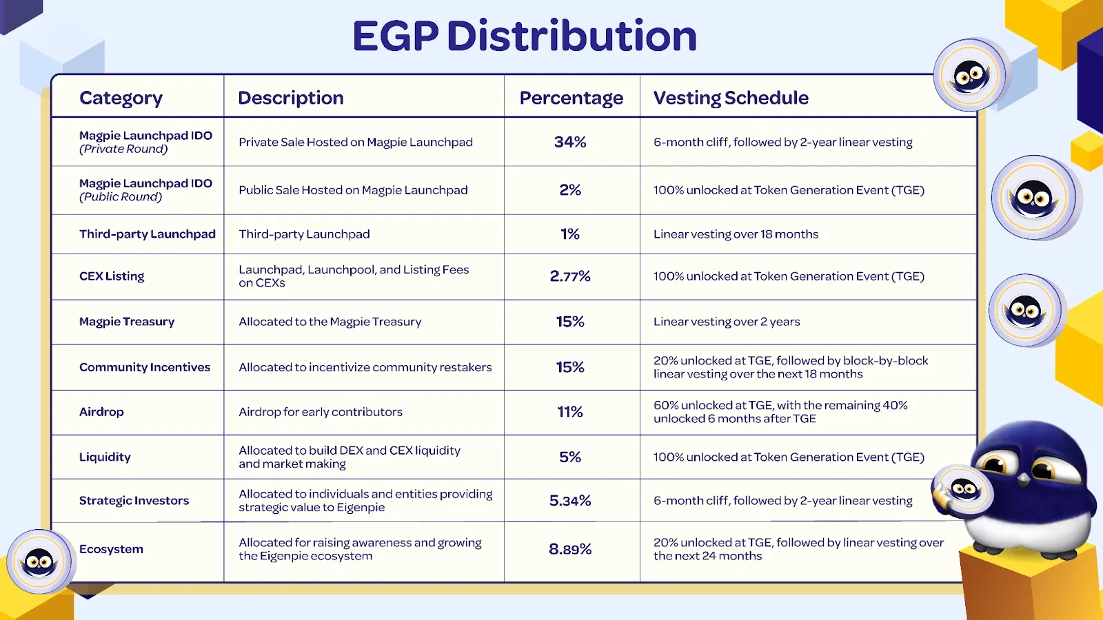 34%: Magpie Launchpad IDO(私募轮), 6 个月锁定期,随后 2 年线性解锁;