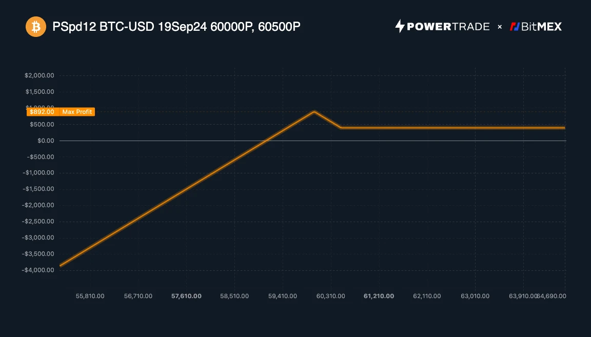 最大收益:当比特币价格跌至或略低于较低行权价(60, 000 美元)时实现