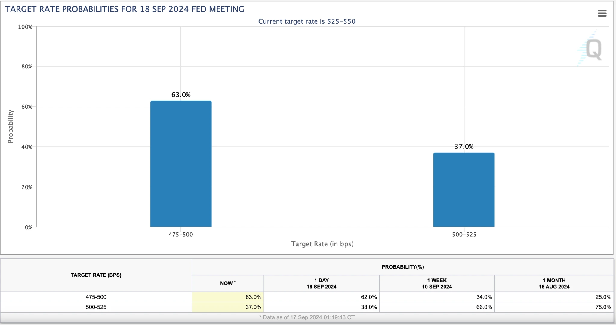 根据芝商所(CME)数据,市场对 50 个基点降息的预期已从上周的 34% 显著增加到今天的 63% 。这一大幅上涨促使比特币价格从 58, 000 美元上涨至 61, 000 美元。通常,芝商所数据能准确预测美联储的利率决策,因此在距离联邦公开市场委员会(FOMC)会议如此之近时出现如此大的波动和分歧是不寻常的。这不仅表明市场犹豫不决,还可能意味着美联储最终决策存在重大不确定性。