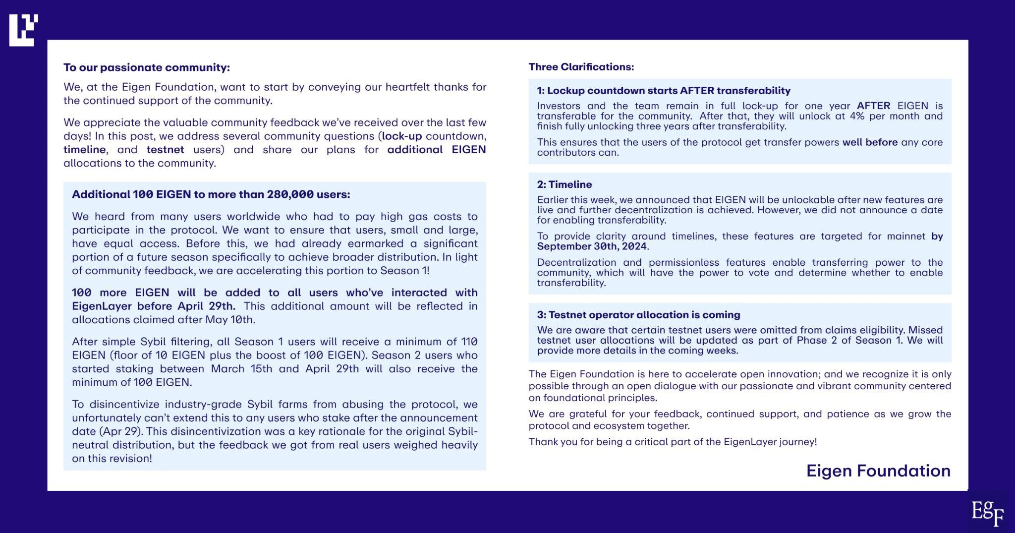 之所以传出该谬误理解,是因为 Eigen 基金会 5 月在关于解锁时间线的官方文档中提到了 9 月 30 日这个日期,但如果你细看 Eigen 基金会的描述,会发现描述其实是: “本周早些时候,我们宣布 ElGEN 将在上线新功能和进一步去中心化后解锁(after new features are live and further decentralization is achieved),但是我们并未公布具体日期,为了明确时间规划,我们计划在 2024 年 9 月 30 日之前在主网实现这些功能(these features)。”