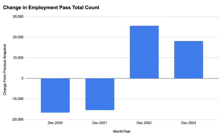 新加坡作为商业中心的吸引力并非只是传闻。会计与企业管制局 (ACRA) 的数据显示,新加坡公司注册数量持续呈上升趋势(图 2)。而人力部 (MoM) 的数据显示,就业准证 (EP) 增长在后新冠疫情时代出现反弹(图 3):