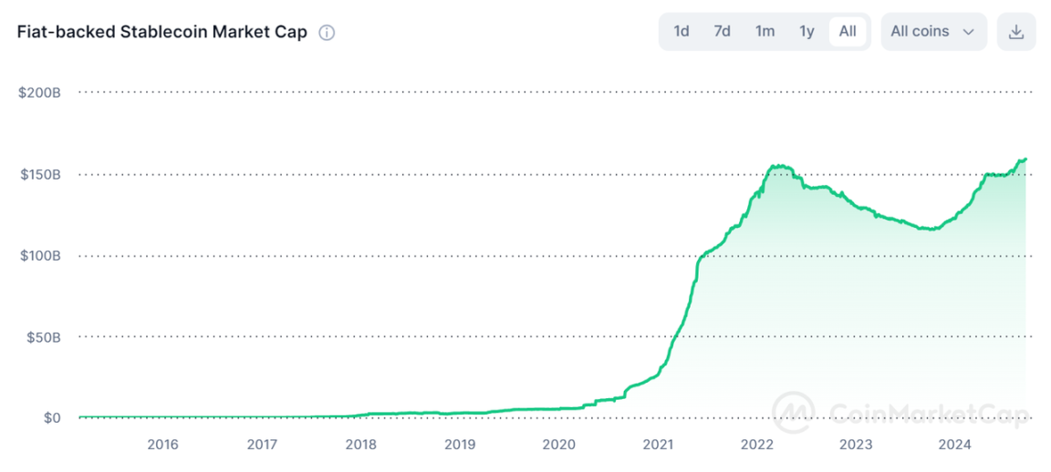法币支撑的稳定币的总市值也已经创下历史新高,并且仍在不断攀升。