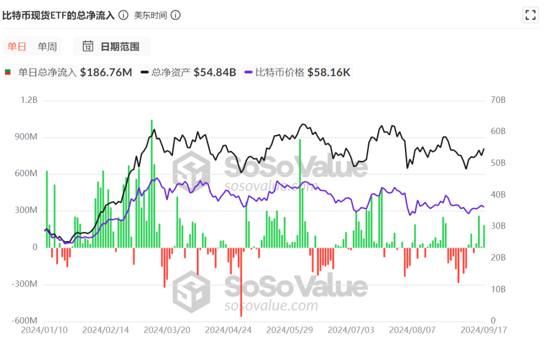 截止 9 月 17 日,比特币现货 ETF 已累计总净流入达 175 亿美元。 8 月末至 9 月初的连续 8 天净流出终结, 9 月 12 日起,比特币现货 ETF 实现连续 4 天净流入。