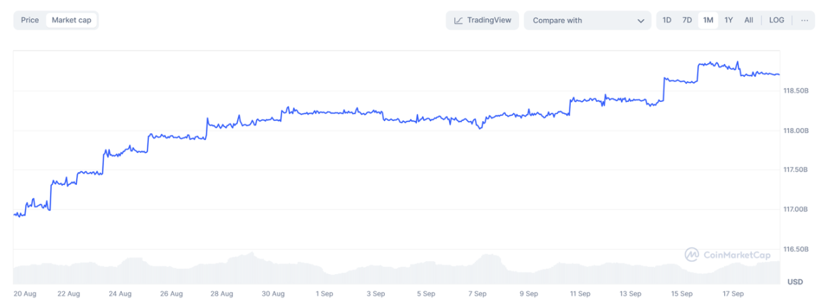 另一大稳定币 USDC 市值,则从 8 月末的 344 亿美元,升至 355 亿美元,不到一月即流入 11 亿美元。