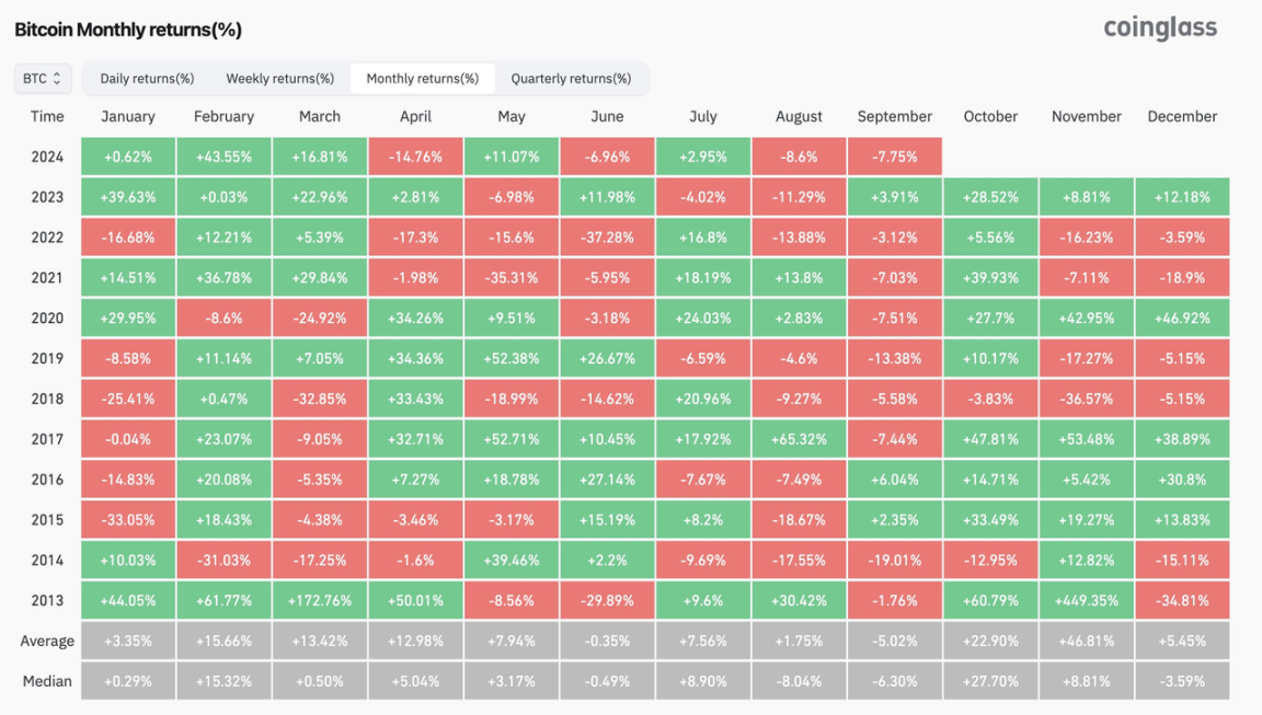 加密市场的有趣之处在于,与部分股票等类似,都会出现季节性趋势。比如,夏季市场普遍表现惨淡,而在年末以及年初又表现不错。比特币在过去的 9 年里,除 2018 年的 10 月份因处于熊市而下跌外,从 2015 年至 2023 年皆获得强劲正回报。
