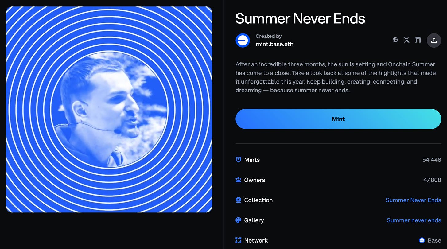 帖子中的 Onchain Summer 精华视频 也是一个 NFT,到目前为止已经铸造了超过 54, 000 个 NFT。