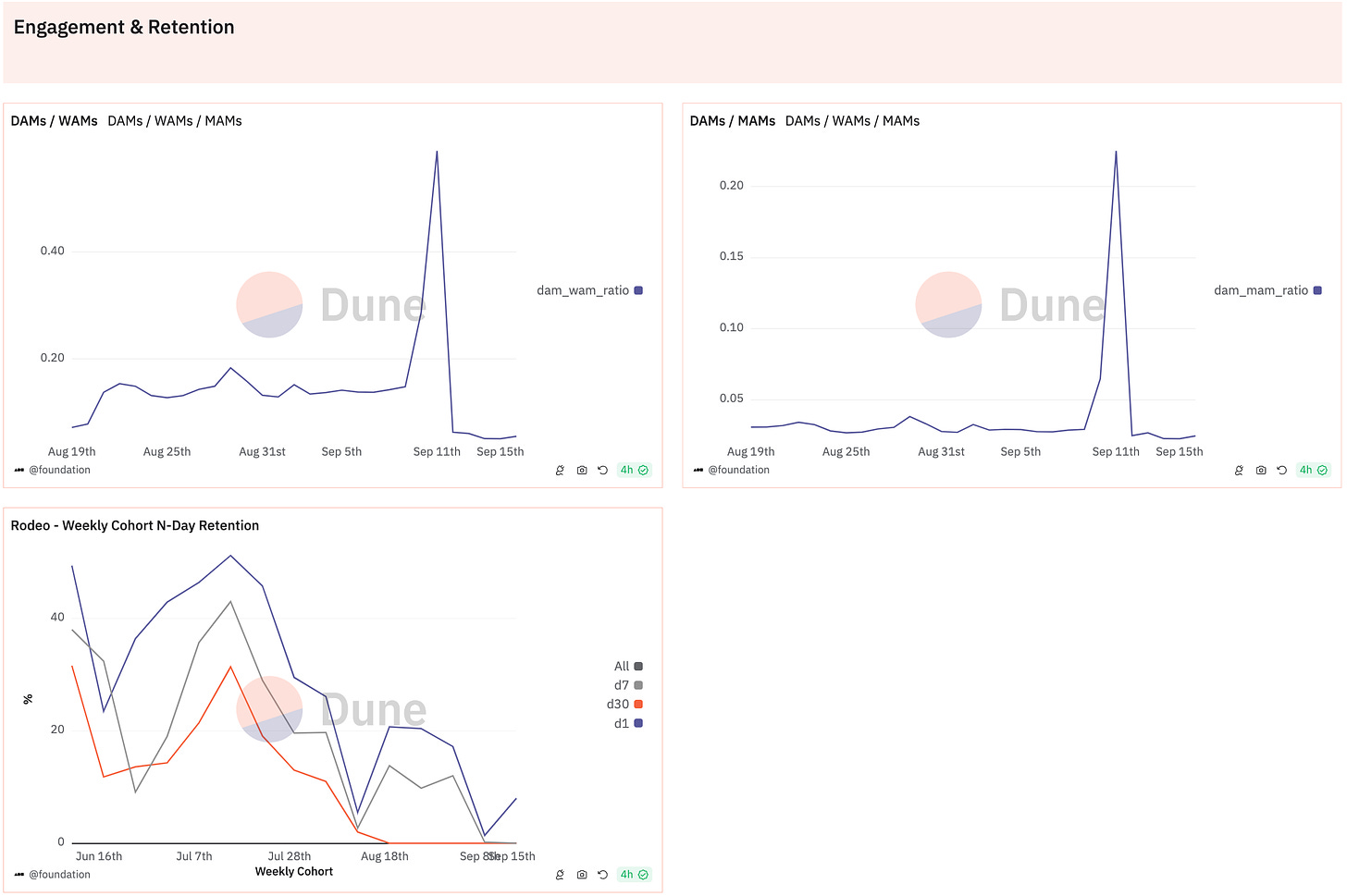 Rodeo 在不断添加功能的同时显示出缓慢而稳定的增长迹象。值得注意的是,他们的 公共 Dune 仪表板 正在关注保留率和铸造的参与度。