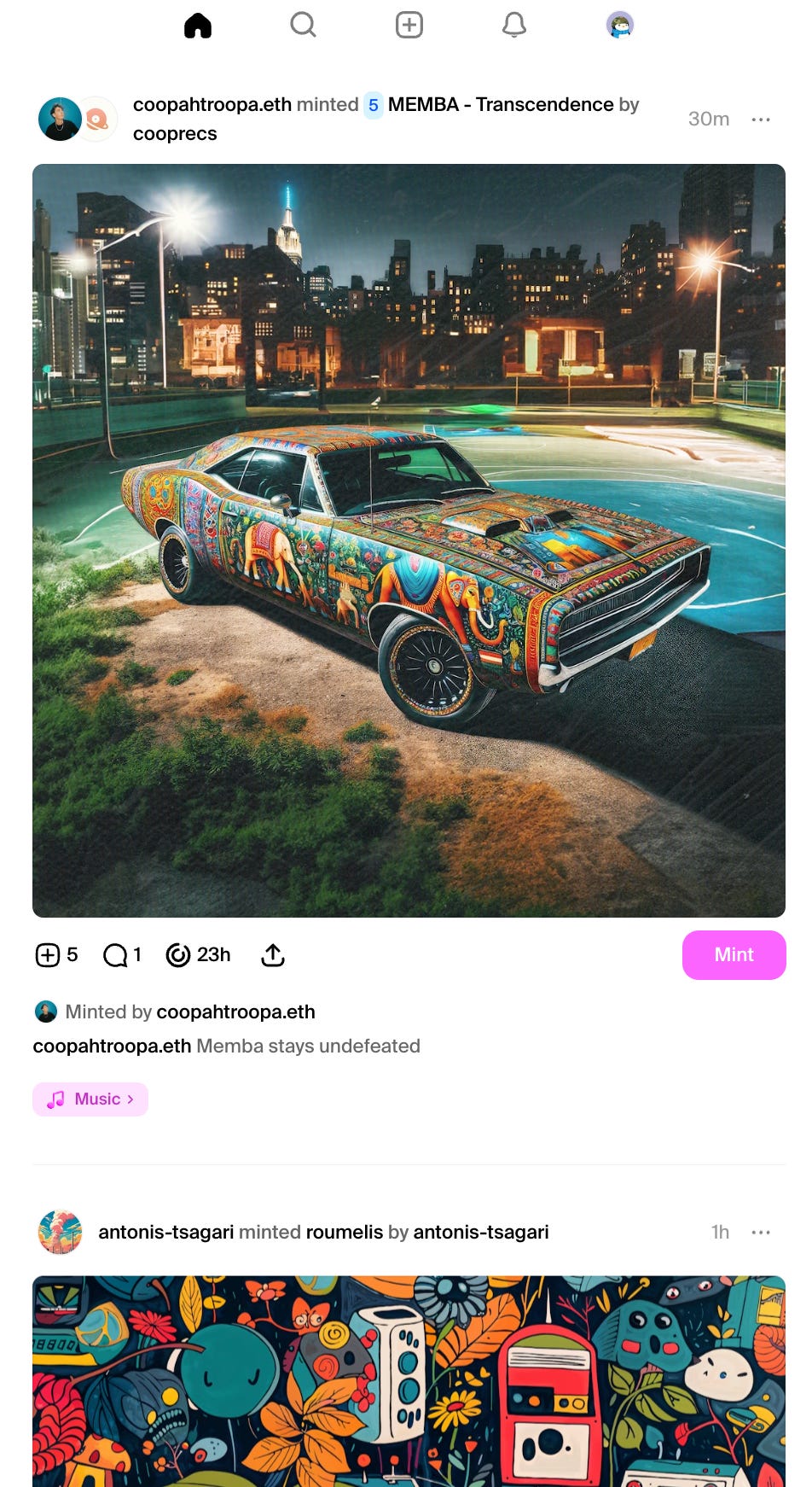 信息流是根据你关注的账户或他们铸造的内容来填充的。在这种情况下,你关注的账户成为了“影响者”。在上面的截图中,coopahtroopa 是这个影响者。