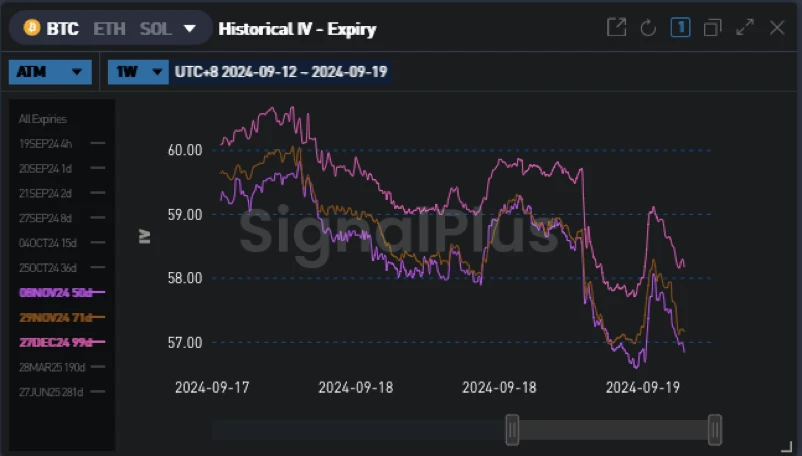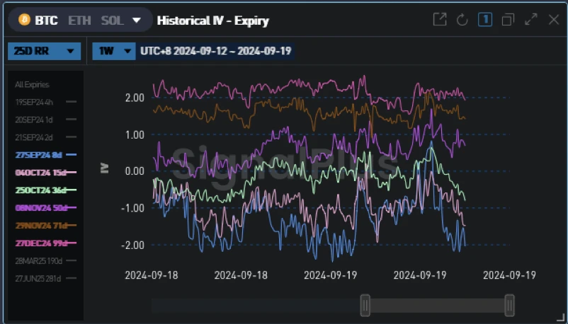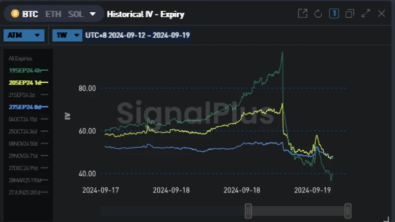 BTC/USD 9 月 27 日 ATM 波动率 -7.0 v ( 54.5 -> 47.5) ;12 月(年底)ATM 波动率 -1.4 v ( 59.6-> 58.2), 12 月 25 d 风险逆转波动率 -0.3 v ( 2.3 -> 2.0)