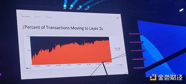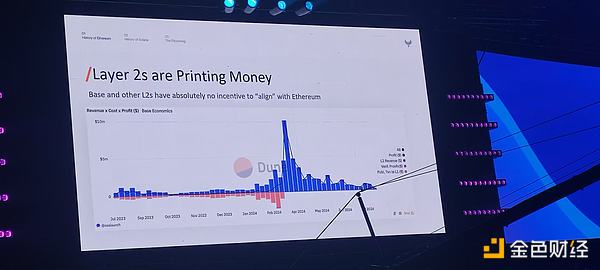 我们可以看到过去三四年里,交易从 L1 转移到 L2 的比例。这一点非常明显,现在几乎所有的交易都在 L2 上,90% 以上的交易都发生在 L2 上。这是按计划进行的,他们确实实现了目标,但结果是什么呢?他们一直在谈论所谓的 DA 价值规则。而实际上,L2 才是赚到钱的一方。