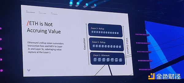 让我们回顾一下:以太坊已经存在 9 年了,花了 5 年时间才确定扩展计划,又用了 7 年才完成从工作量证明(PoW)到权益证明(PoS)的转型。以太坊从未明确过它想要成为什么。扩展计划不断变化,没有明确的方向。他们不知道自己在优化什么。因为这个 roll-up 路线图,他们实际上已经将大部分的价值增值从 ETH 转移到了 L2,比如 Base 等项目上。